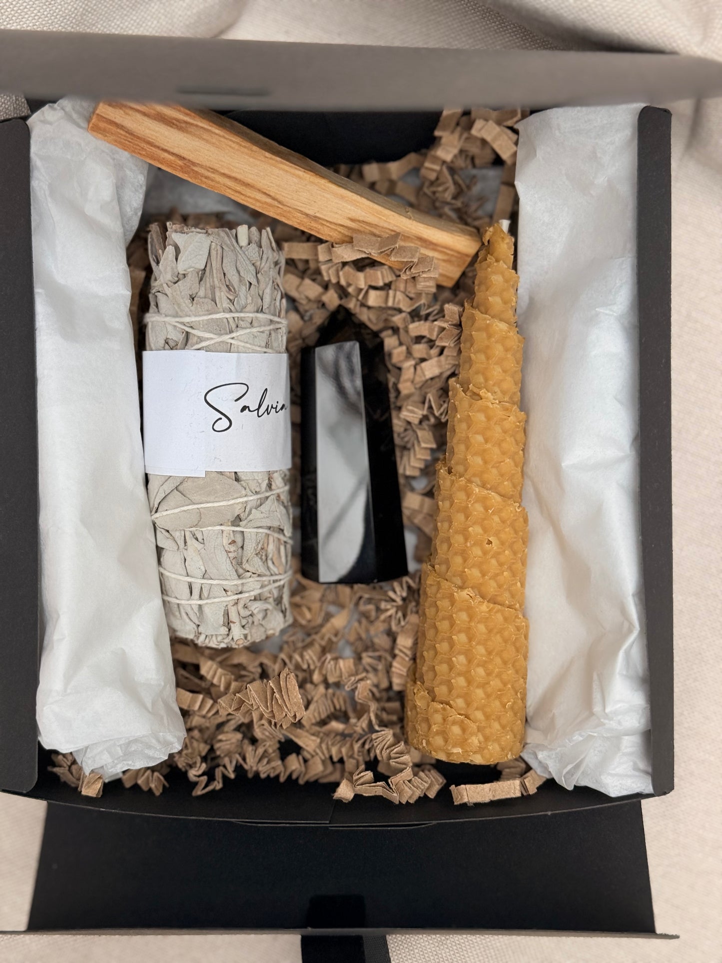 Incluye salvia blanca, palo santo, vela de cera de abeja y una punta de obsidiana elegida por su fuerza y poder de transformación.