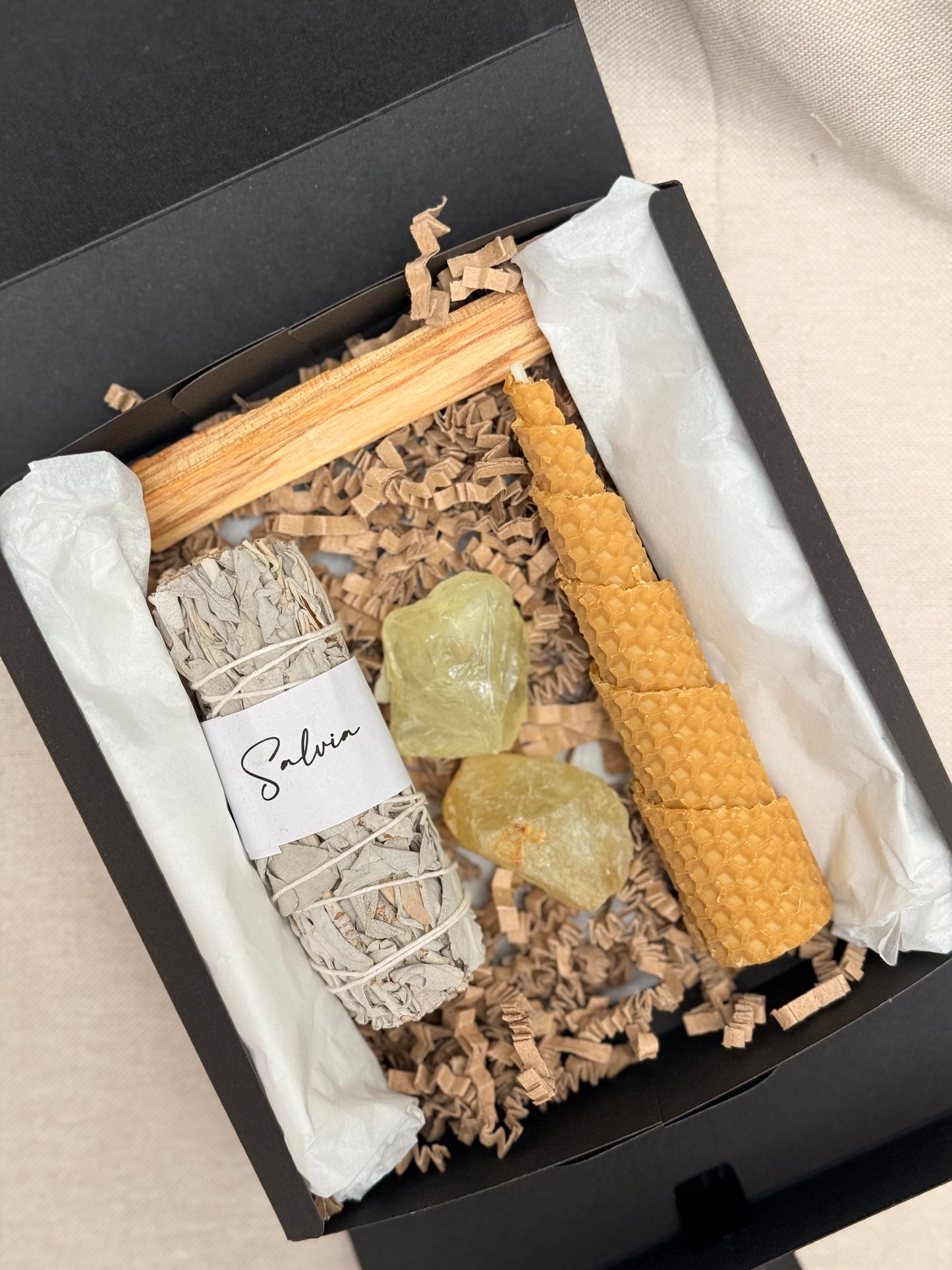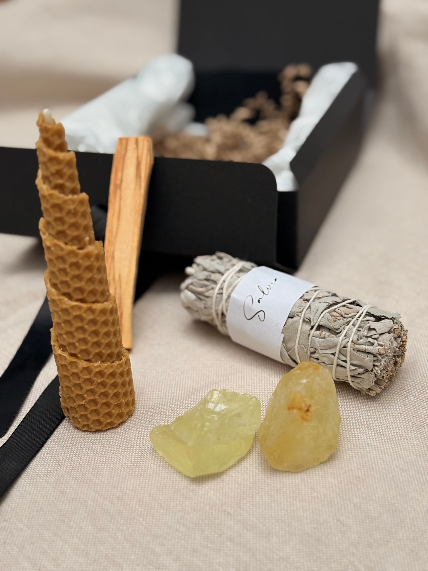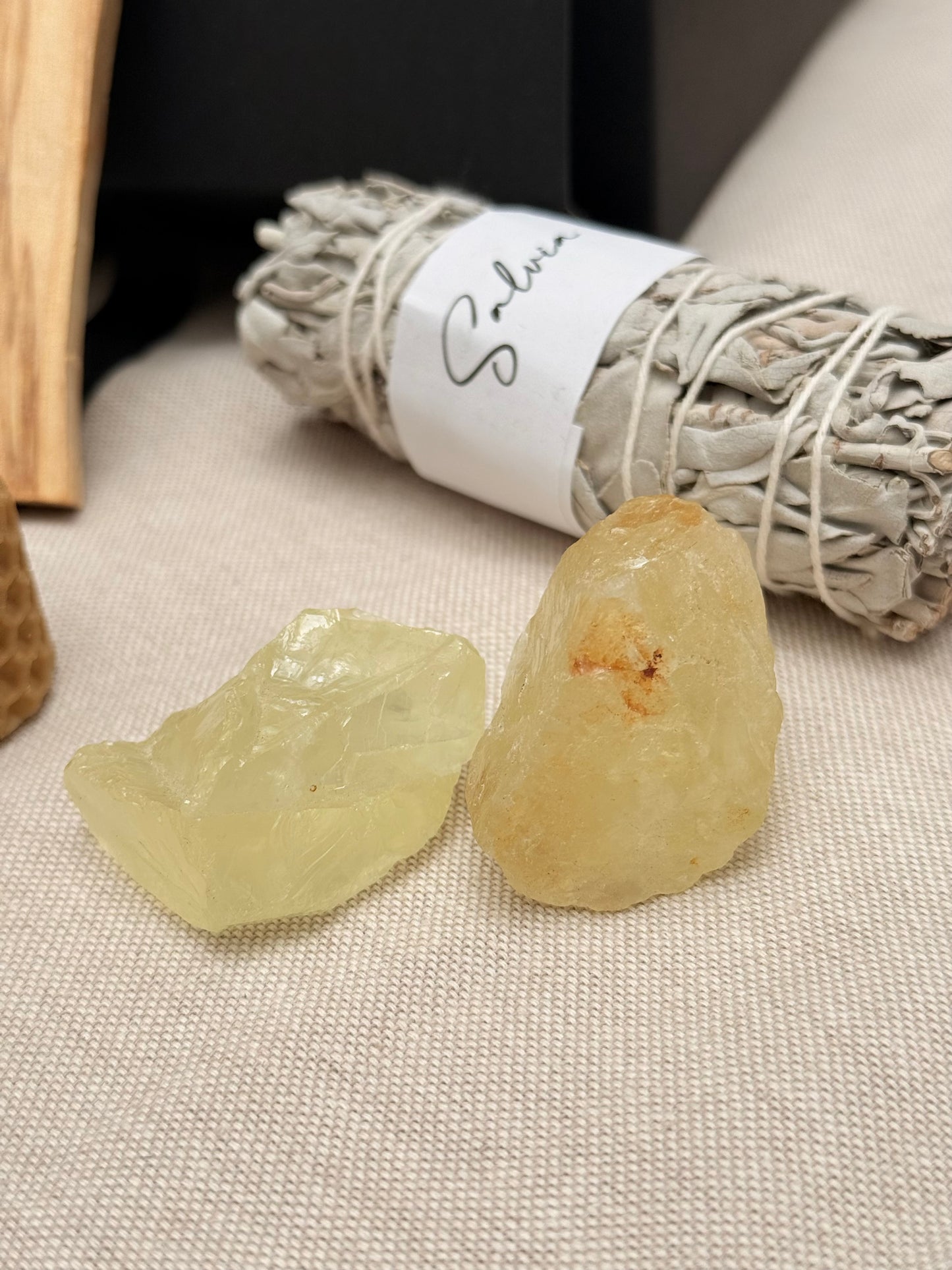 Este pack de limpieza energética con dos piezas grandes de citrino en bruto incluye salvia blanca, palo santo y vela de cera de abeja artesanal.