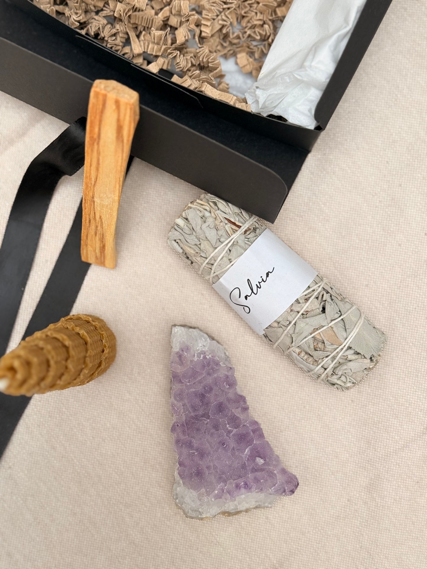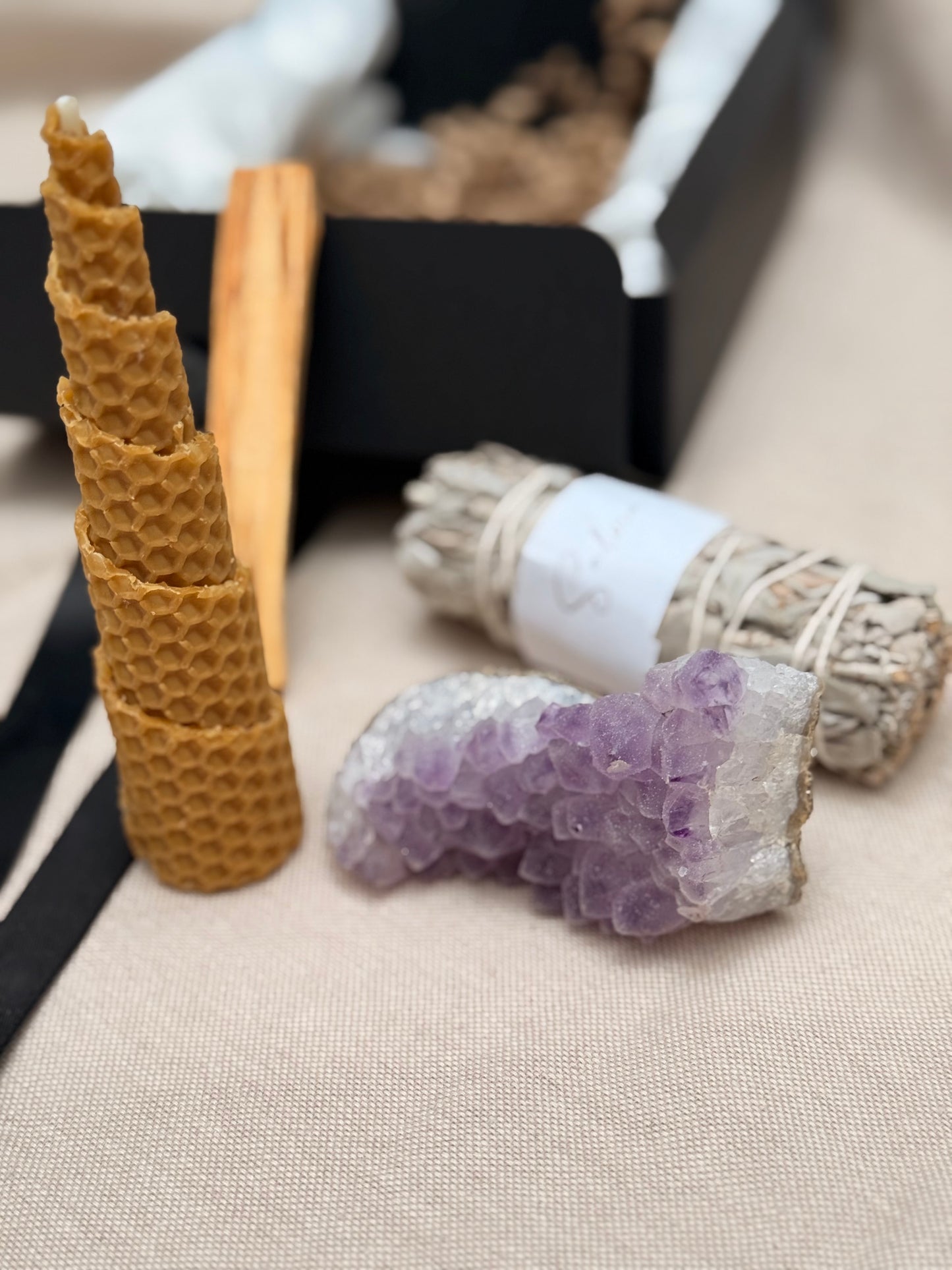 Este pack artesanal combina salvia blanca, palo santo, vela de cera de abeja y una geoda de amatista natural, para armonizar tus espacios y acompañarte en momentos de descanso o meditación.