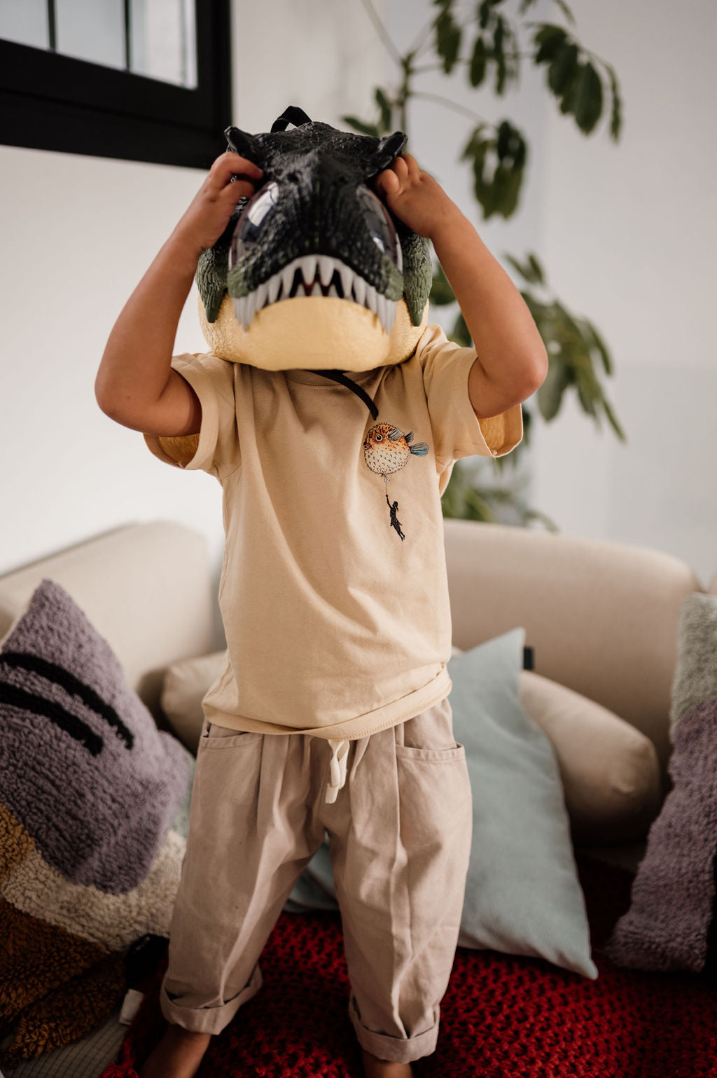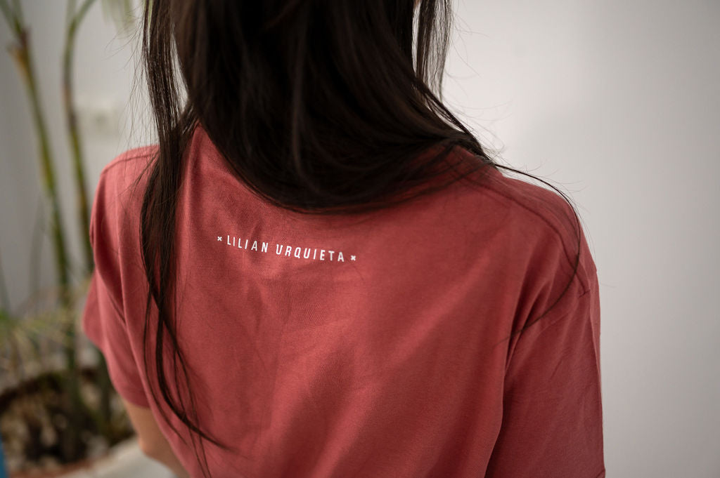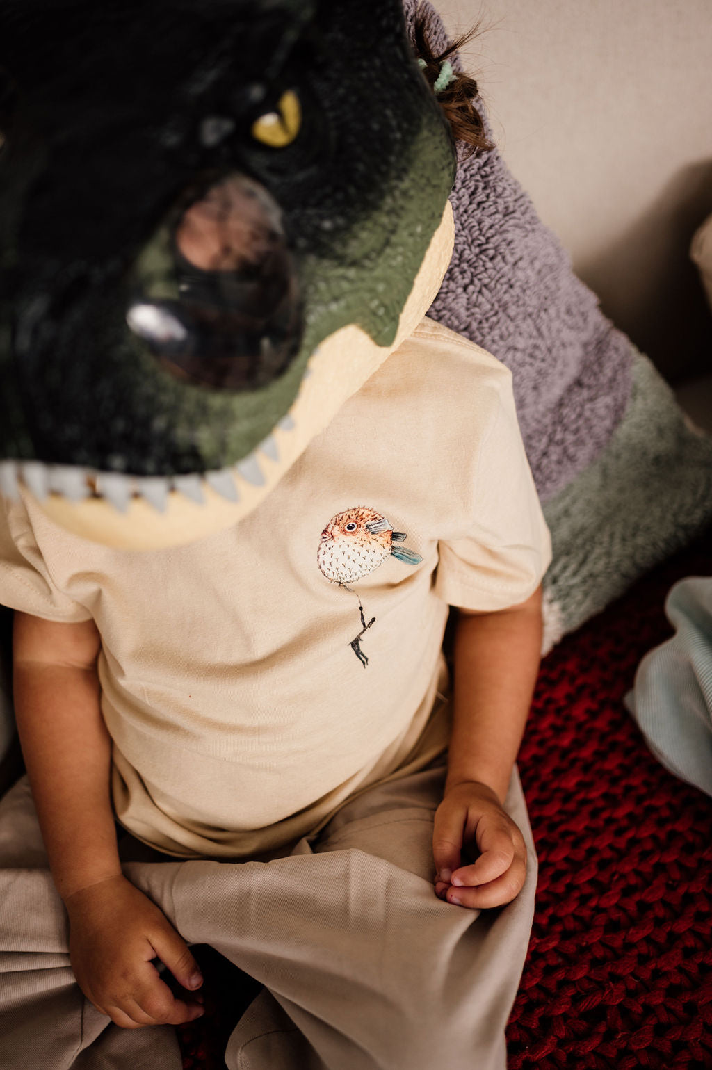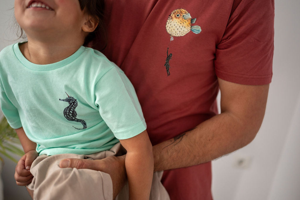 Camiseta de algodón 100% con ilustración original del “Pez Erizo” en el pecho y logo de Lilian Urquieta en la espalda. Un diseño cómodo, suave y atemporal para peques y grandes.