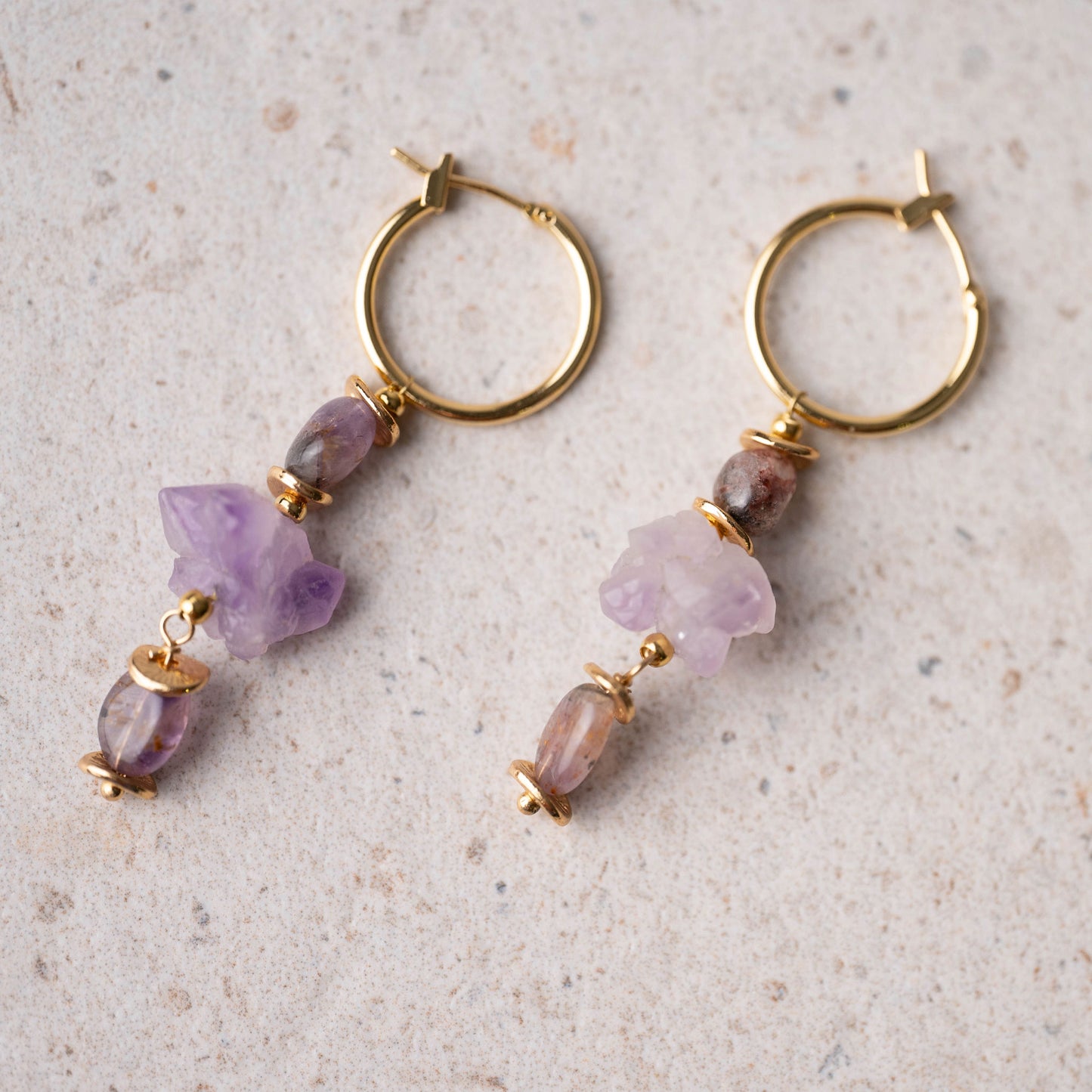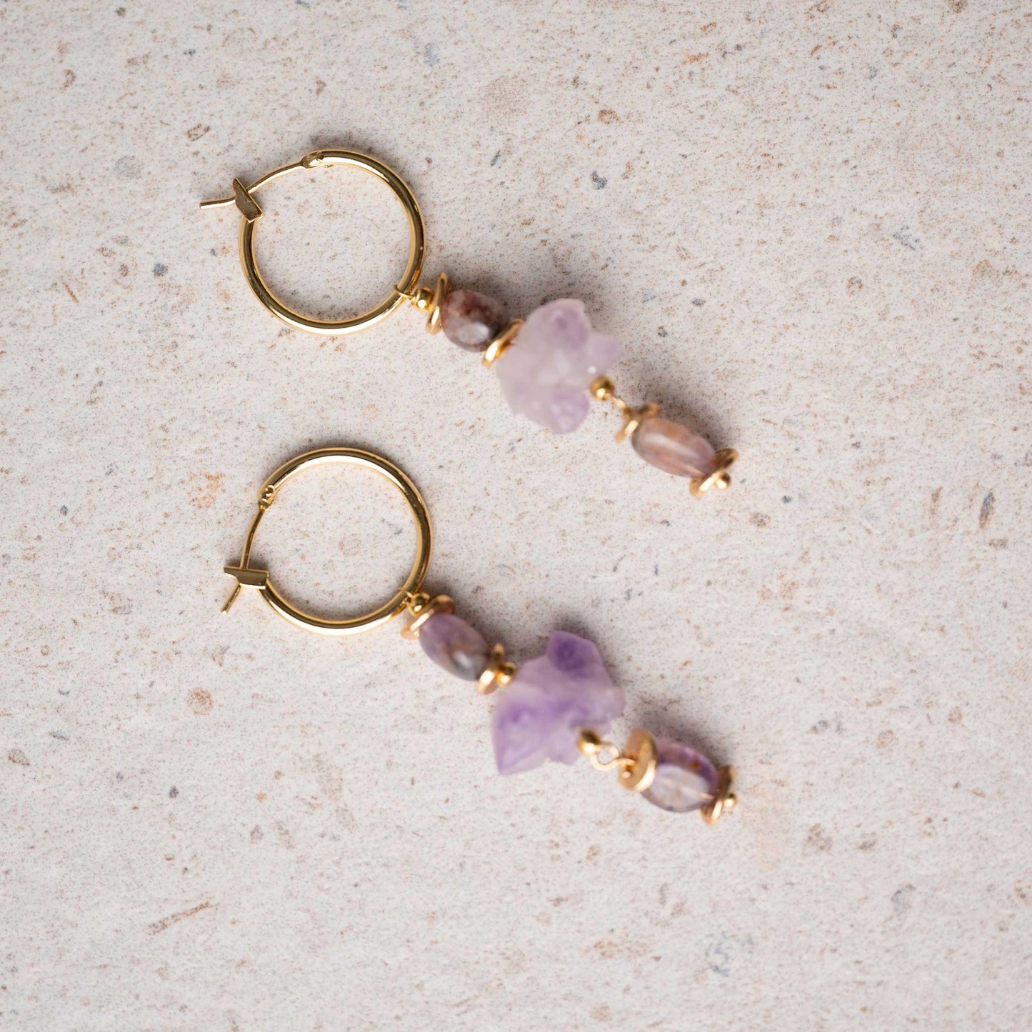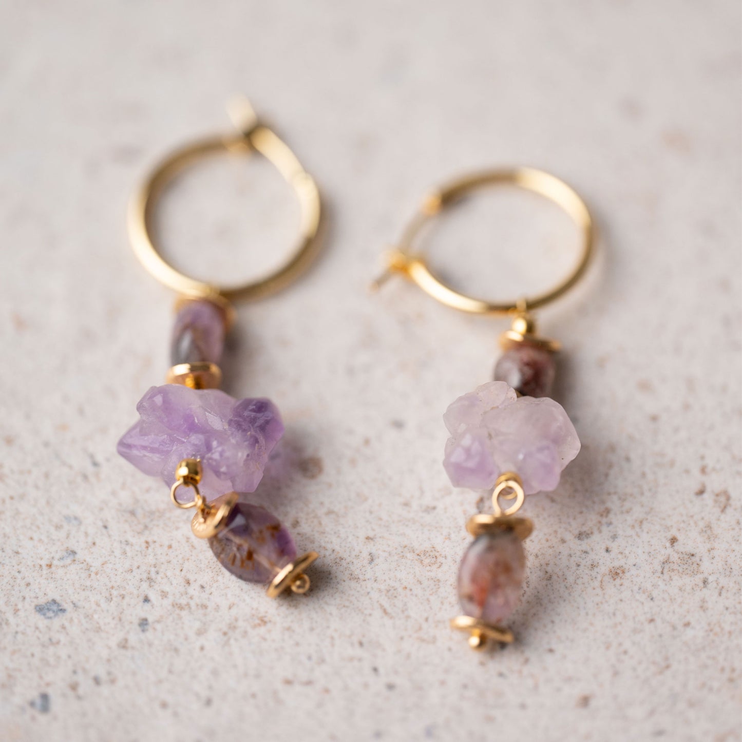 Aros dorados con piezas de amatista natural, montados a mano y pensados para quienes disfrutan de joyas con textura y carácter.