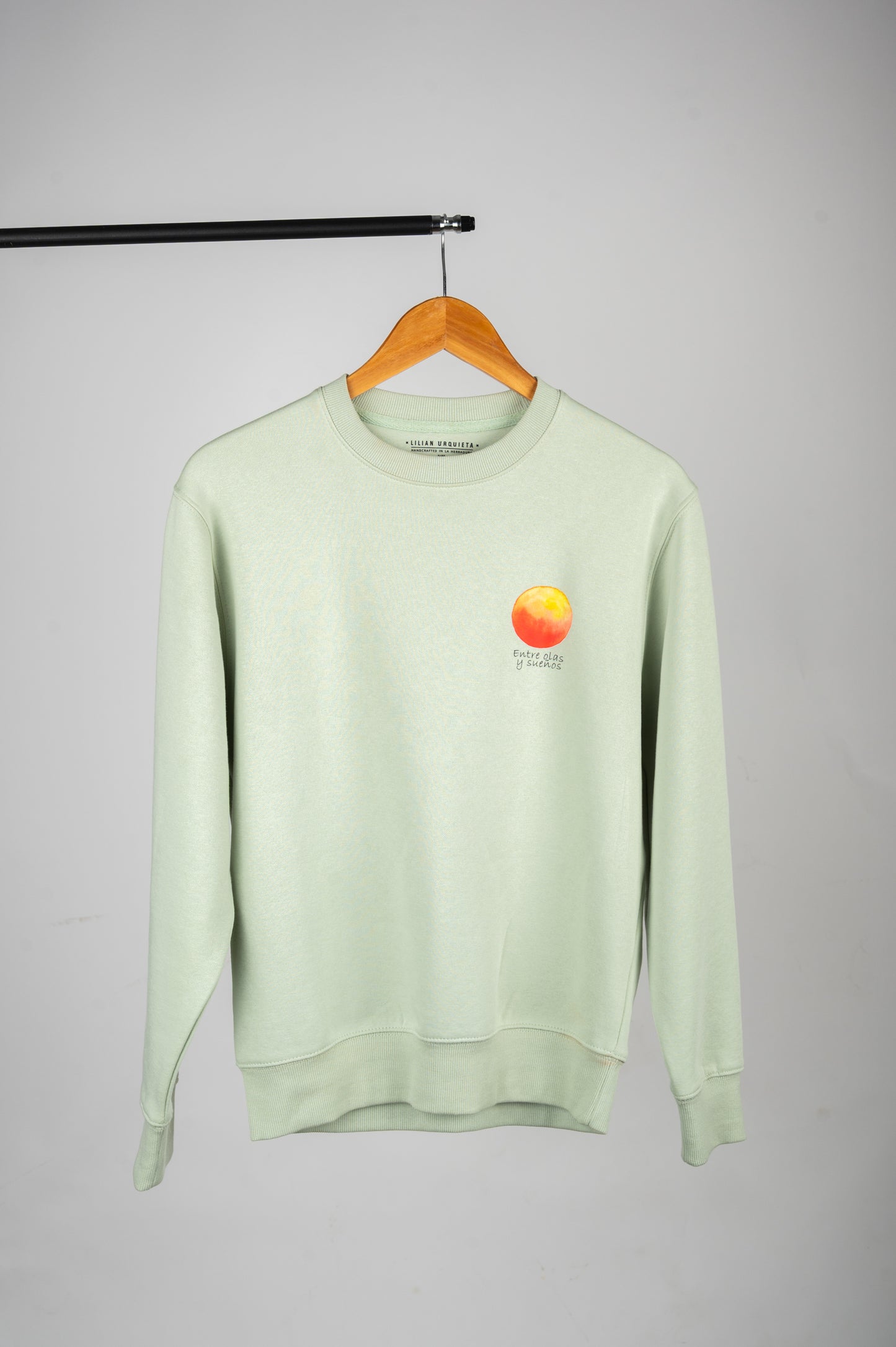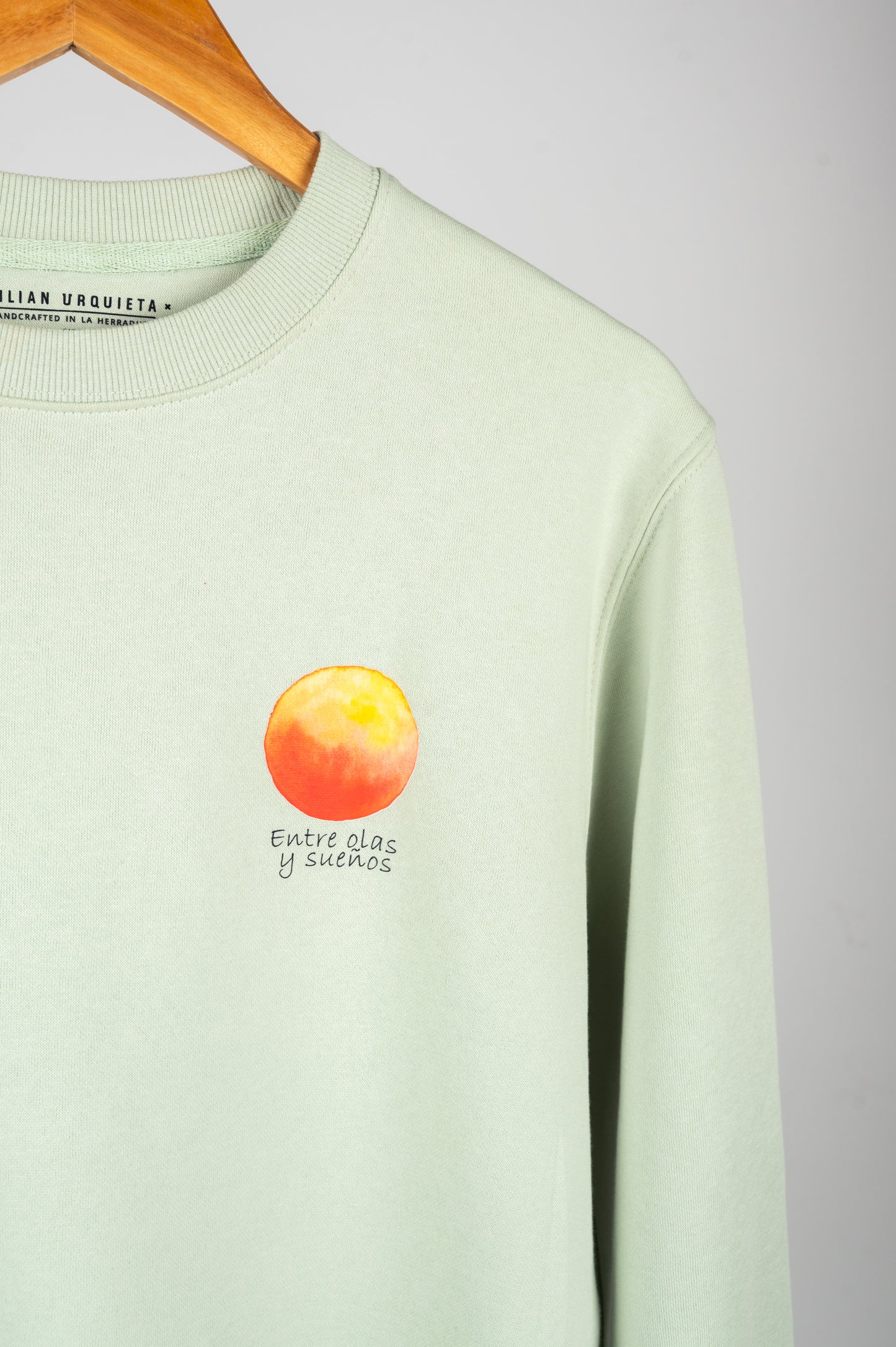 El mensaje frontal “Entre olas y sueños” es un recordatorio de que siempre estamos a tiempo de vivir con profundidad, alegría y libertad. En la espalda, una gran ilustración de una puesta de sol con nuestra playa, Calaiza, convierte esta prenda en una declaración de estilo y espiritualidad oceánica.