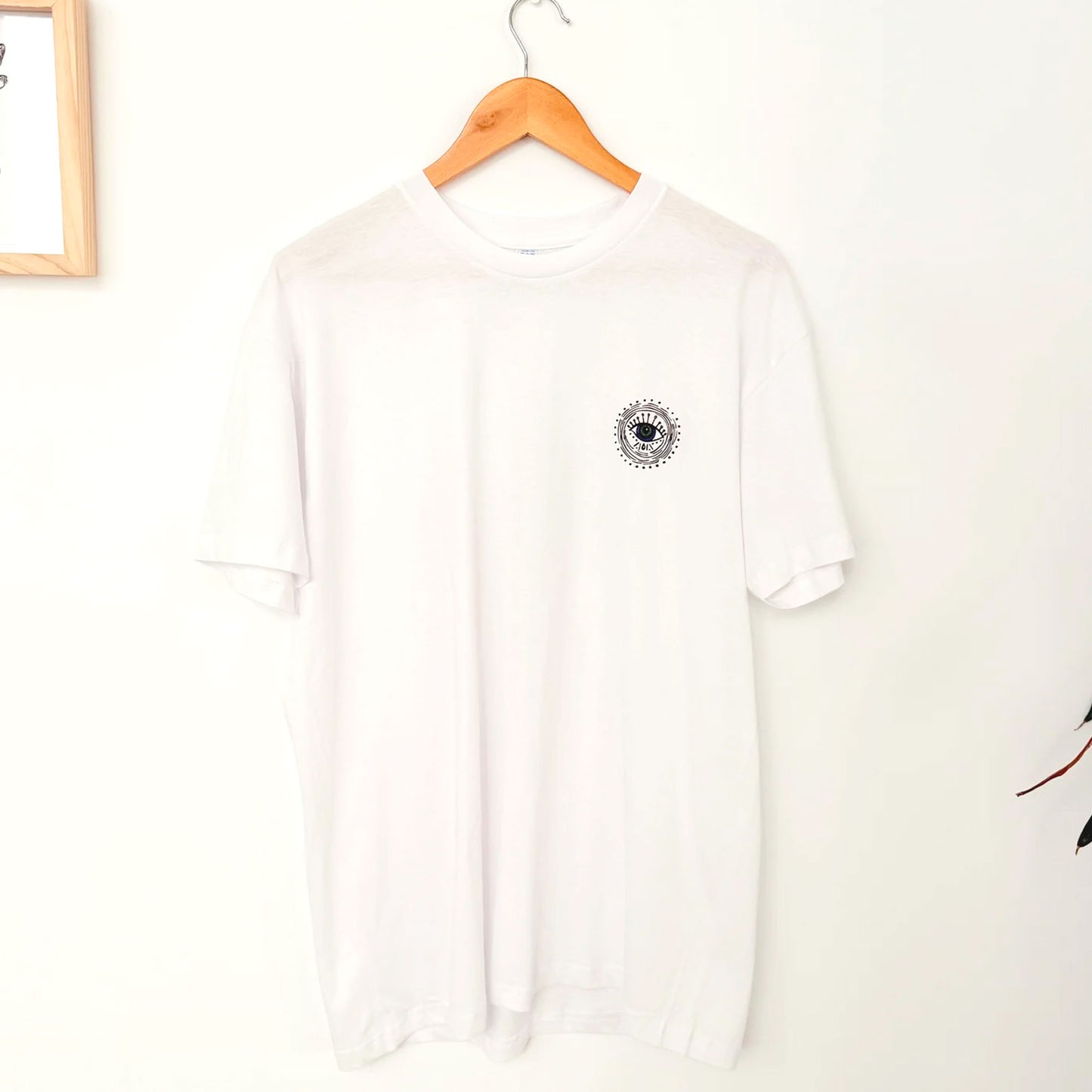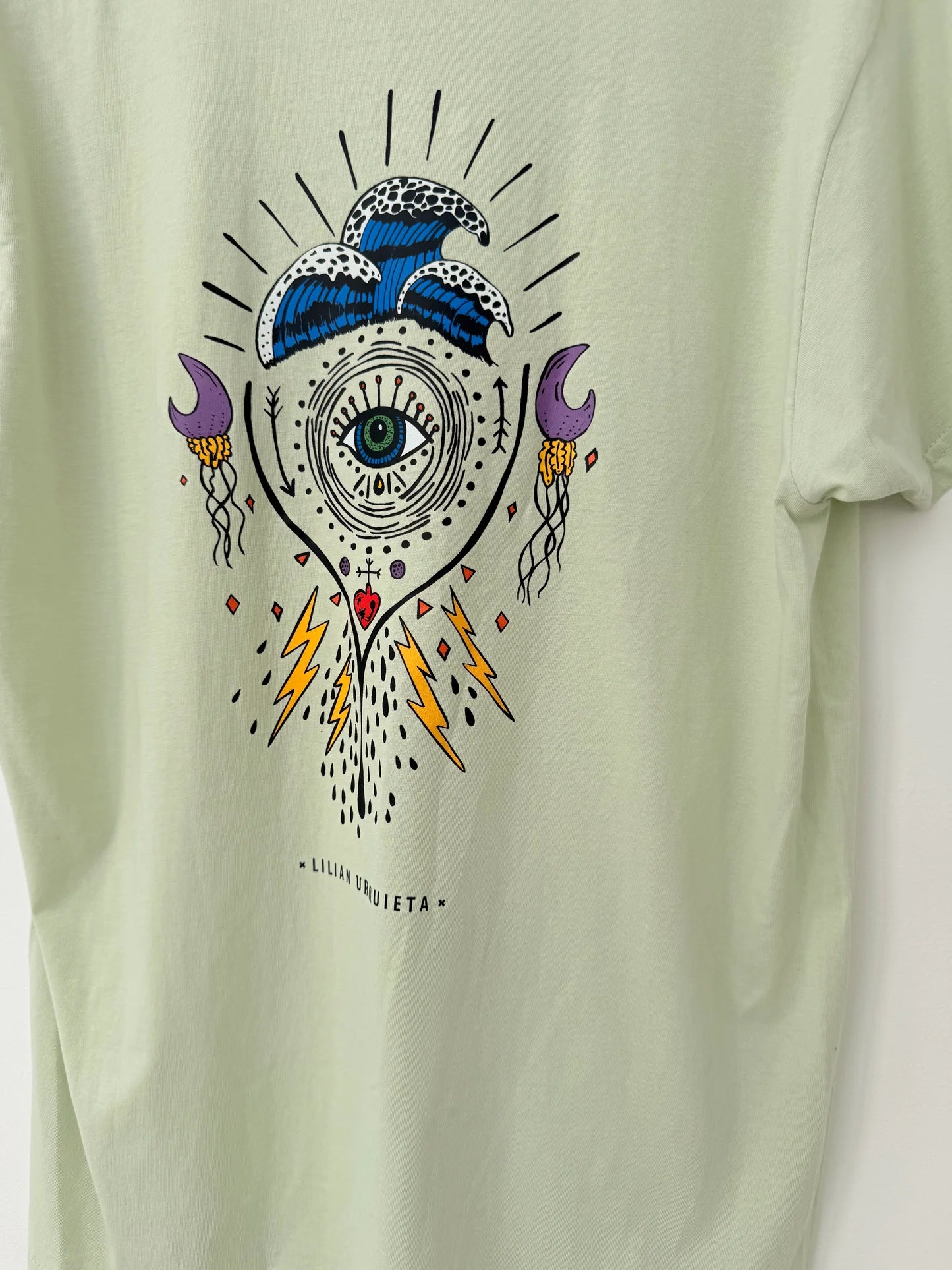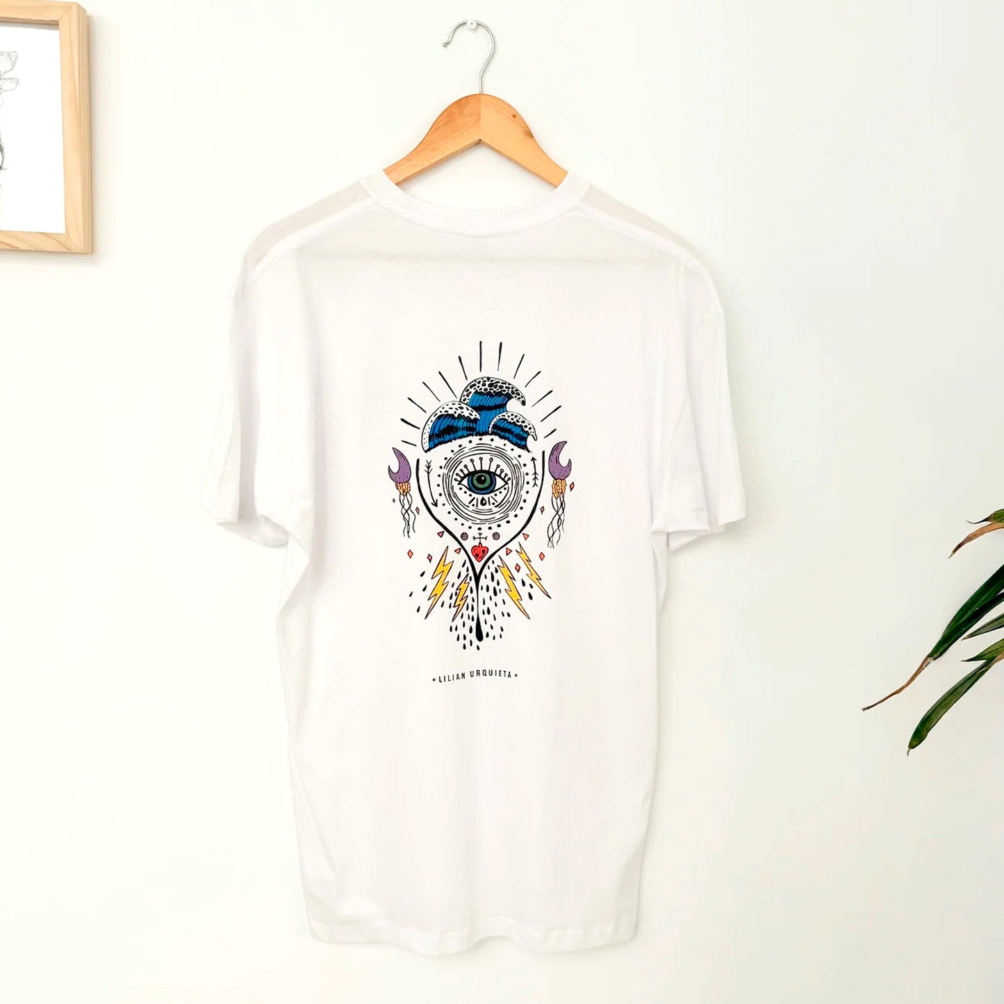 La Camiseta Tormenta Marina Niño nace de un universo en movimiento. Medusas que parecen lunas, olas que respiran, lluvia que limpia y un ojo que observa desde la calma. Una ilustración profunda y poética que conecta con la fuerza del mar y con todo lo que no siempre se ve, pero se siente.