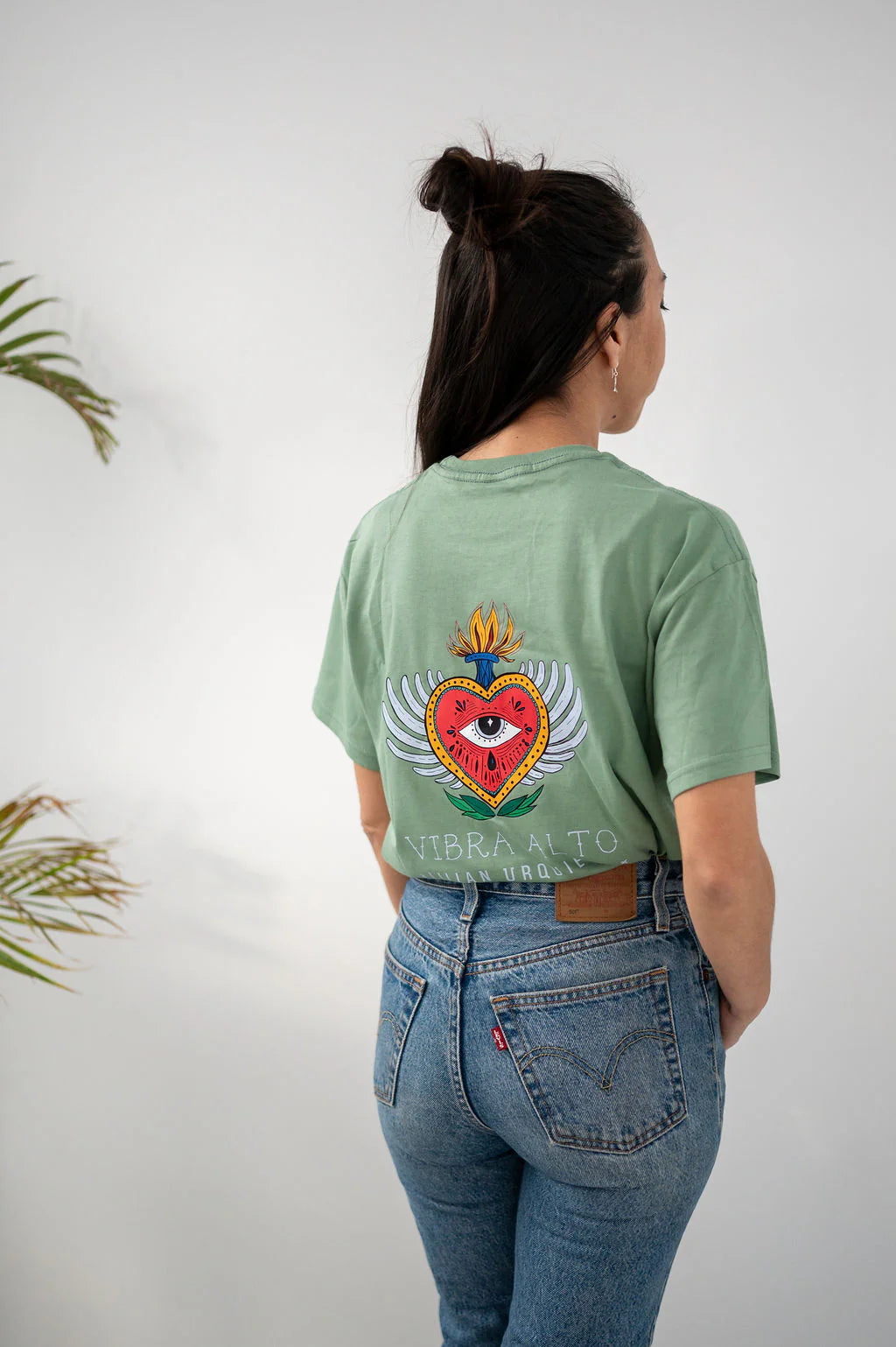 En el pecho, un mensaje sencillo y directo que lo dice todo: “Vibra Alto”. Un recordatorio para elegir lo que suma, caminar con autenticidad y mantener el corazón abierto incluso en los días más densos.
