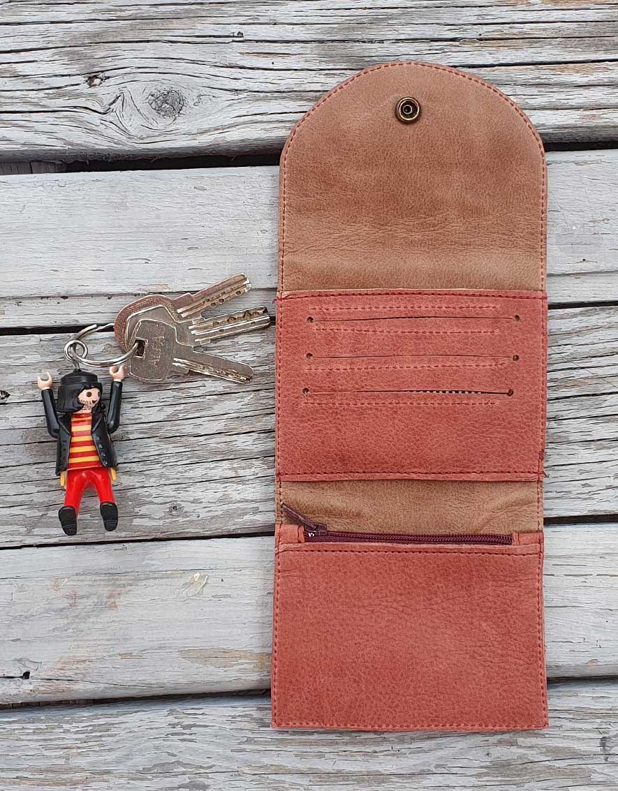 On the inside you will find three sections - a zippered pocket for coins, a space for three cards and a pocket for bills. The wallet is closed by a button and has an outside pocket with a zipper.