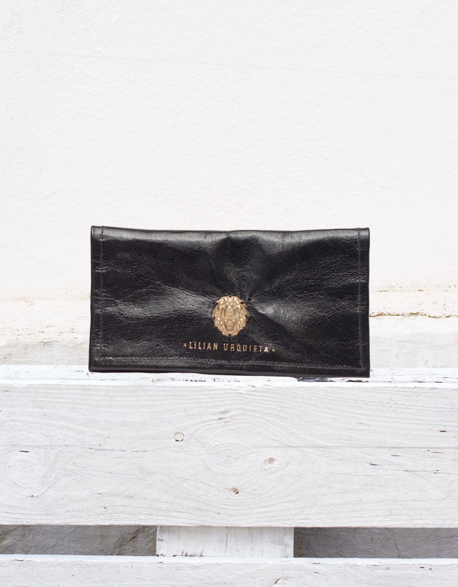 Handmade black leather wallet with a golden lion as the central detail. The interior is the same colour leather as the exterior.