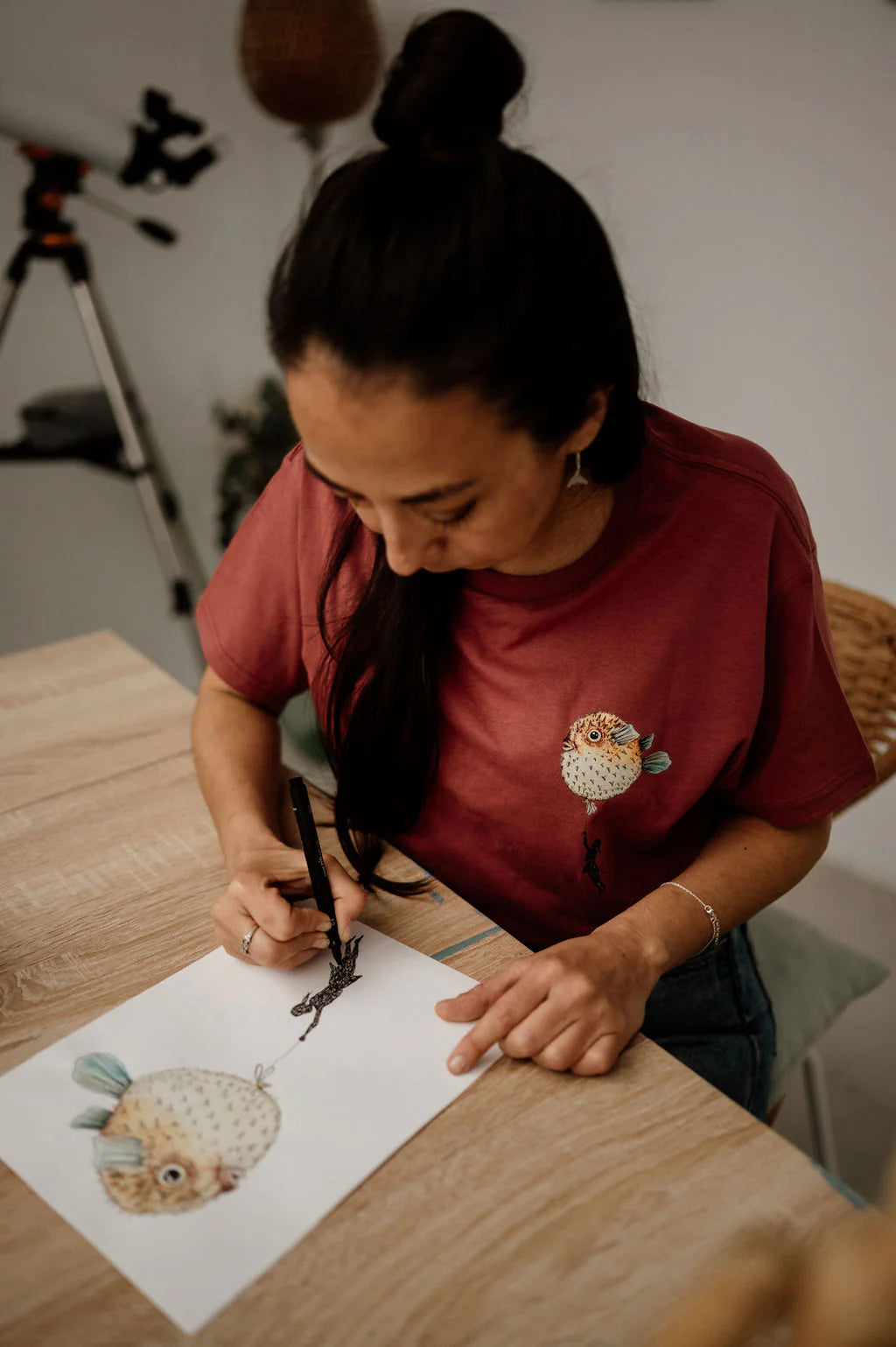 La Camiseta Pez Erizo nace de una imagen sencilla pero llena de significado: un pez que se infla convertido en globo y una niña que se deja llevar, sostenida por un hilo. Un pequeño guiño tierno —y algo irónico— a esa mezcla de miedo y valentía que aparece cada vez que nos atrevemos a soñar.