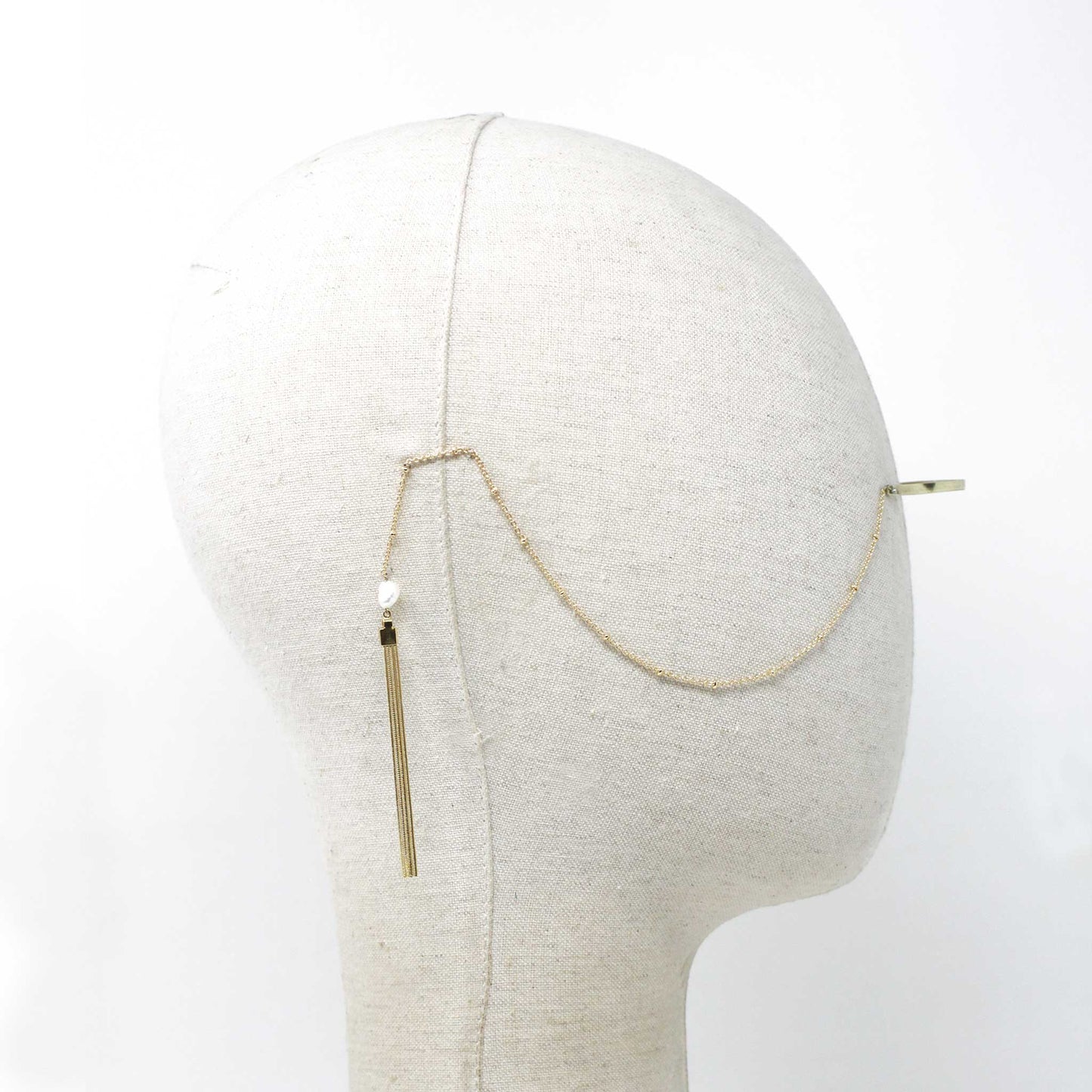 Centerpiece on the nose with chains that rest on the ears, therefore piercings are not necessary. Composed of brass and natural pearls.