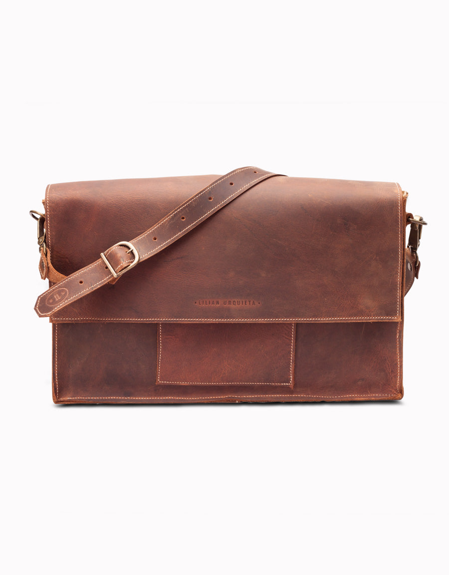 Handmade briefcase in oiled brown leather, specially made to hold cameras. Safely store all parts of your camera thanks to the removable spacers that can be put in place to divide the interior into three sections. This briefcase can also be used in the traditional way, storing laptops and documents. It closes with an old golden magnetic snap and has a front pocket of 15 x 15 cm which closes with a zipper. It also includes an adjustable shoulder strap in the same leather so that the length can be adjusted to the desired measurement.