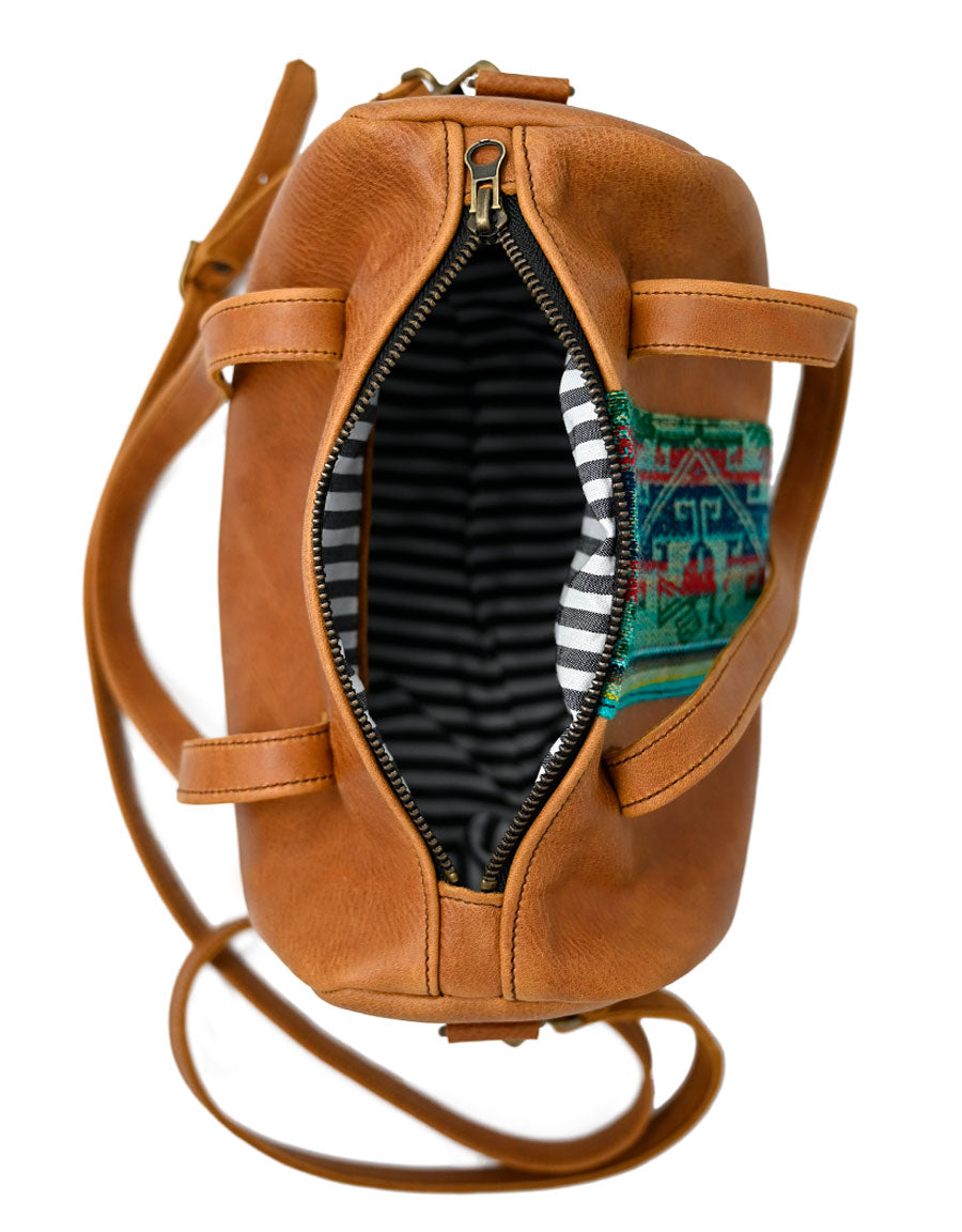 Bowling style leather bag with a central ethnic strip.