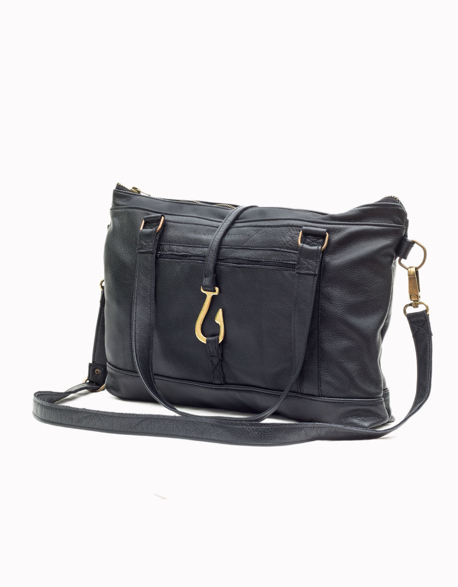 Black bag with gold plated anchor detail handmade with leather, with handles.