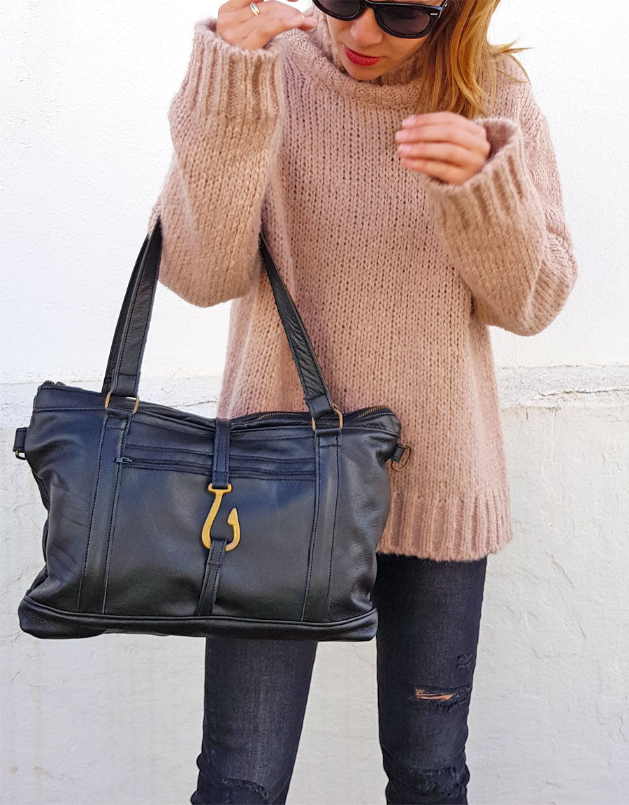 It has a 20 x 15 cm outside pocket with zip fastener. Besides, it can be adapted thanks to the 1,20 m leather strap that is included. This strap is attached to the bag with two antique gold colored carbiners, so you can easily remove them if you need to. The bag has inner lining and inside you will find a big pocket.