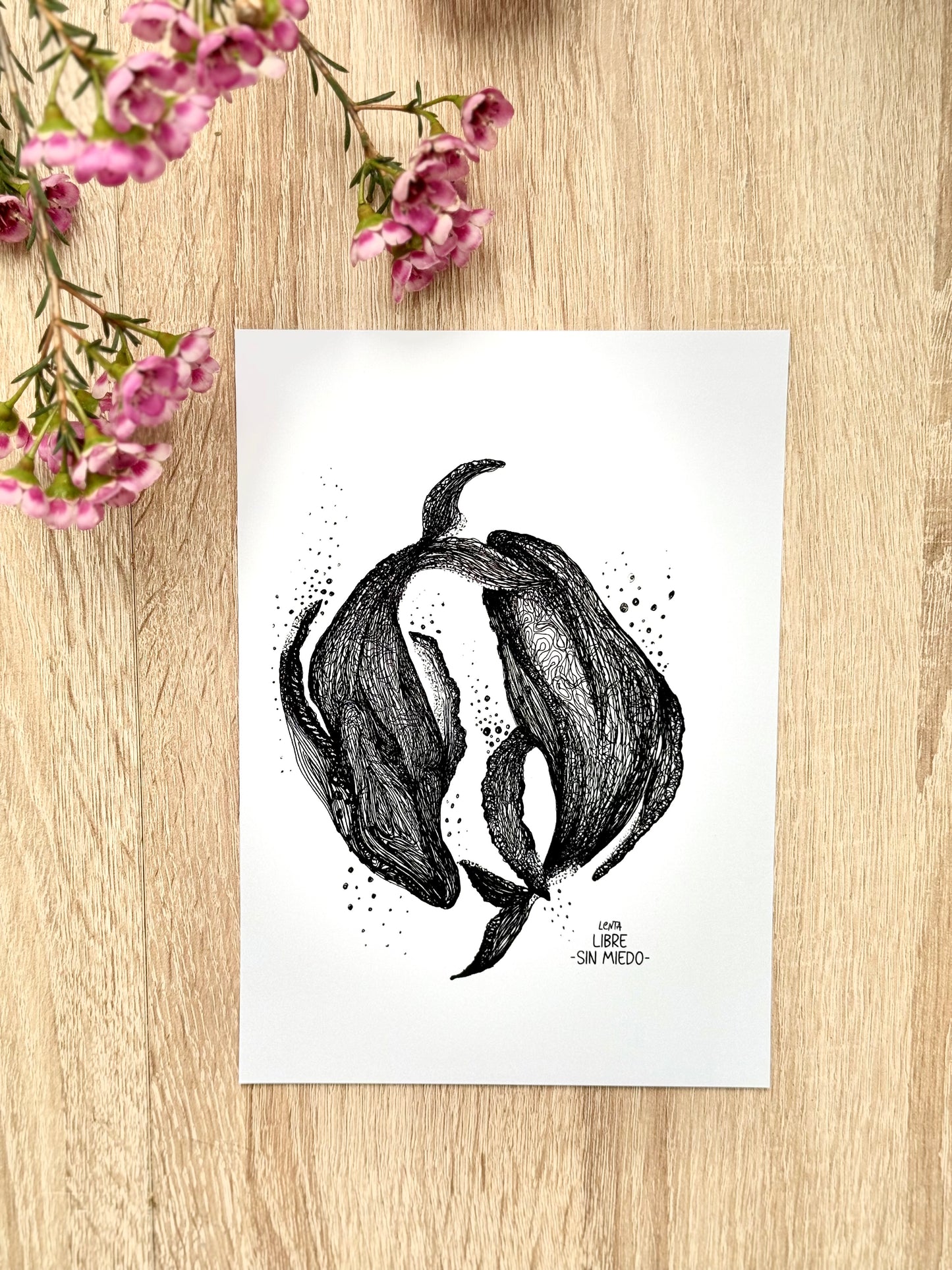 Dos ballenas dibujadas en líneas se entrelazan en este diseño, acompañadas del mensaje “Lenta, libre y sin miedo”. Un recordatorio de moverse por la vida con calma, pero con valentía.