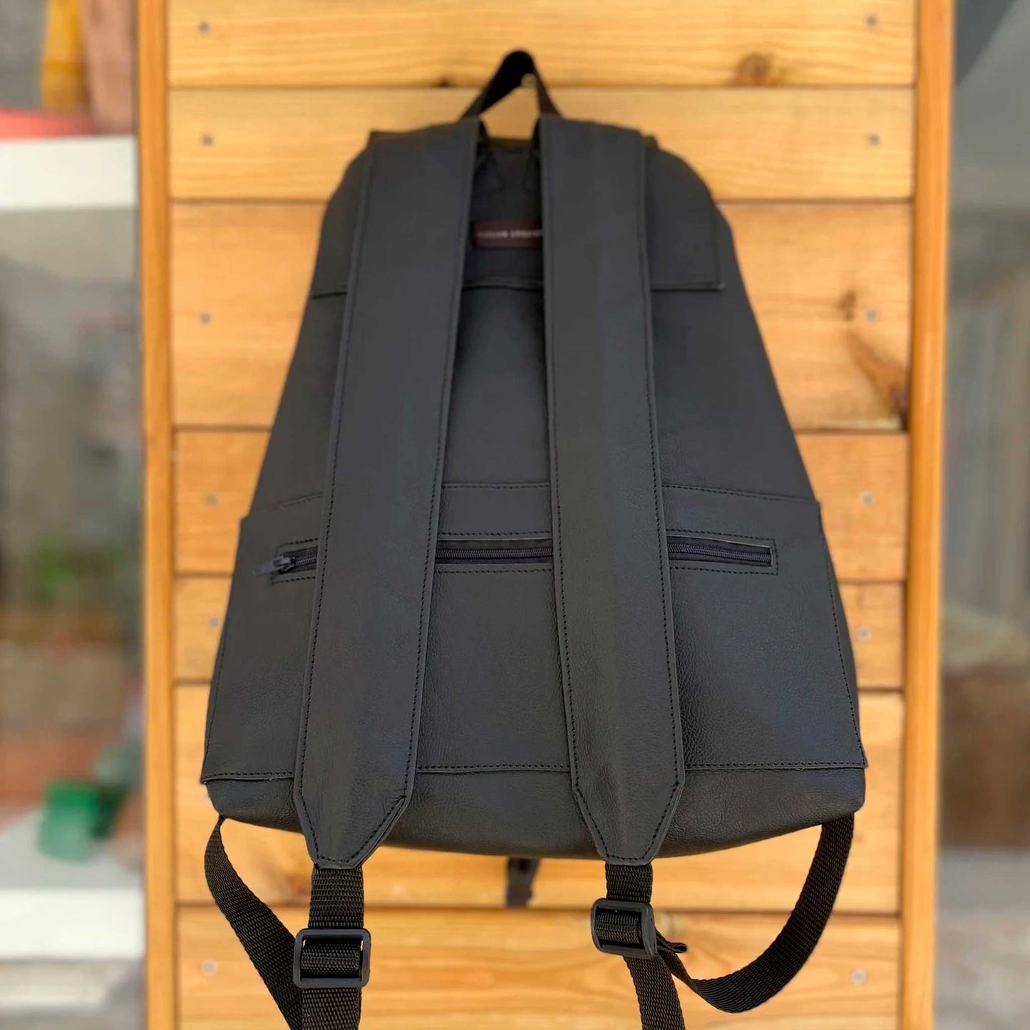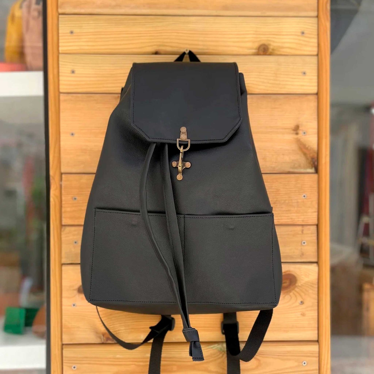 The backpack is very secure and has the capacity to hold and support all of your things. It has a leather cord fastener and a cover that closes with an antique gold carabiner. And in case you are worried about some of your belongings, you can keep them in any of the three pockets that it has. Yes, three pockets: two in the front (14 x 12,5 cm, magnetic seal) and another one in the back (30 x 13 cm, zipper fastener). Your things will be kept safely.