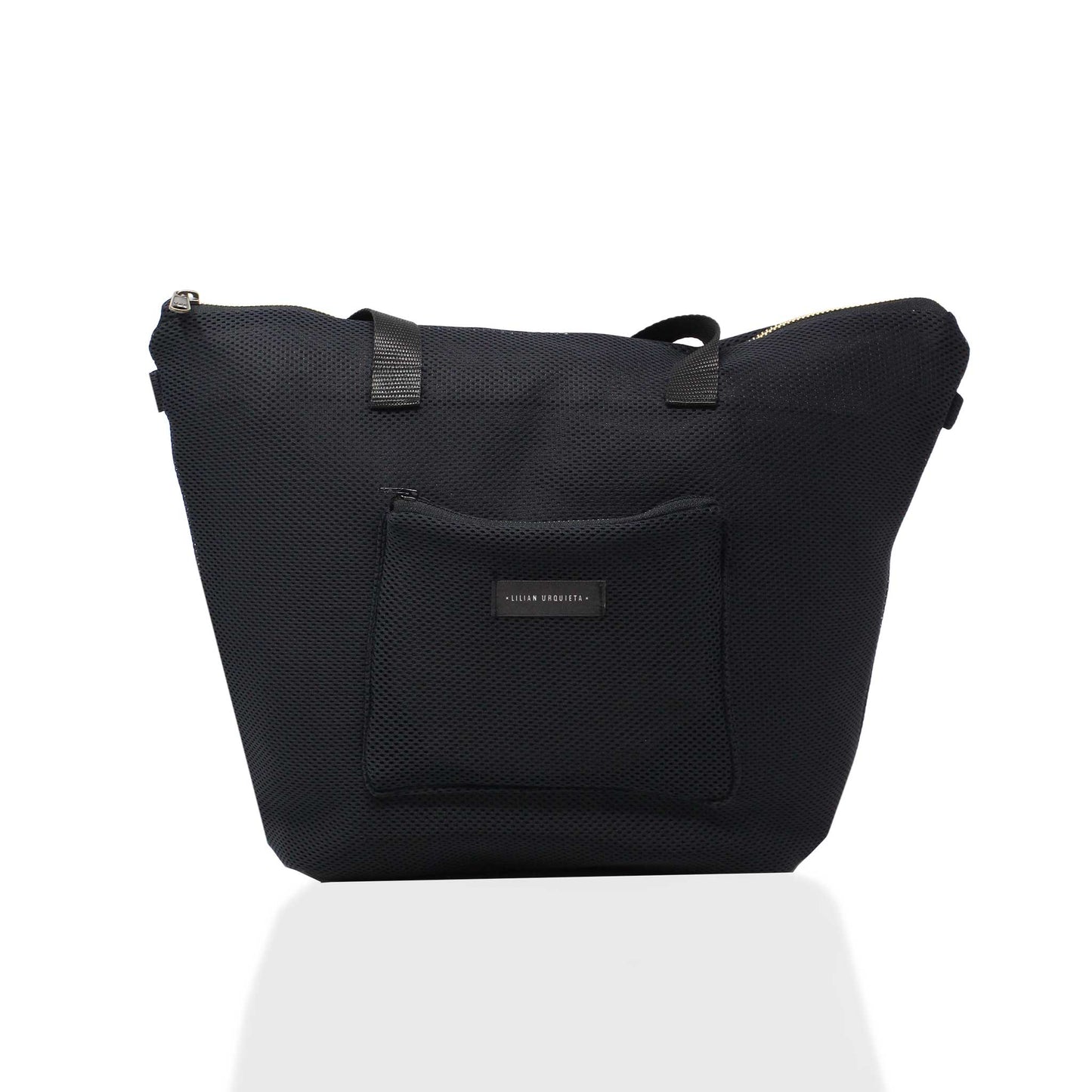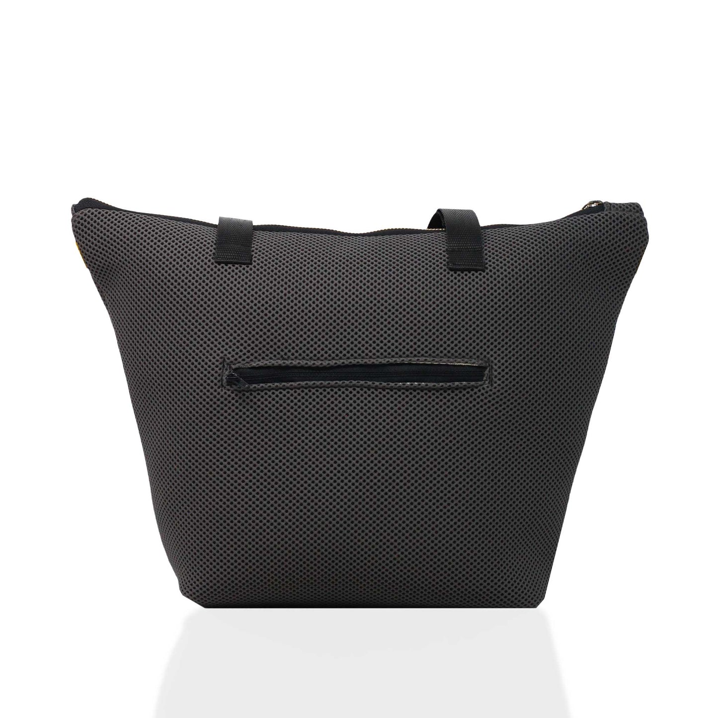 Small shopper bag, made of 3D fabric, comfortable and light. It has several pockets, one on the outside at the back and another integrated in the back, both with zippers.