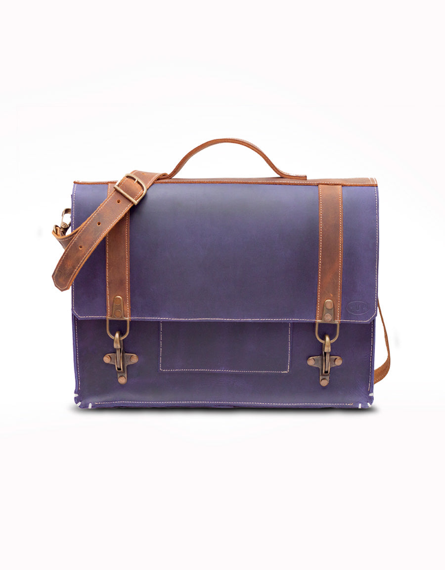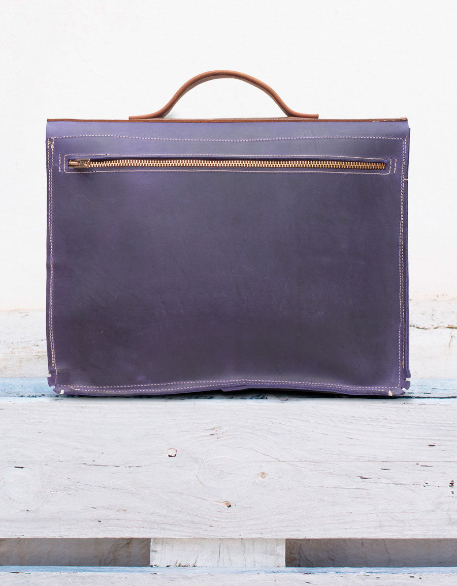 Old school" handmade greasy leather briefcase. Be elegant everywhere with this case, with a carabiner closure in old gold. It has a back pocket and a 15 x 15 cm front pocket, both with a zipper. It also features a shoulder strap and adjustable backpack straps in leather in the same color of the case.